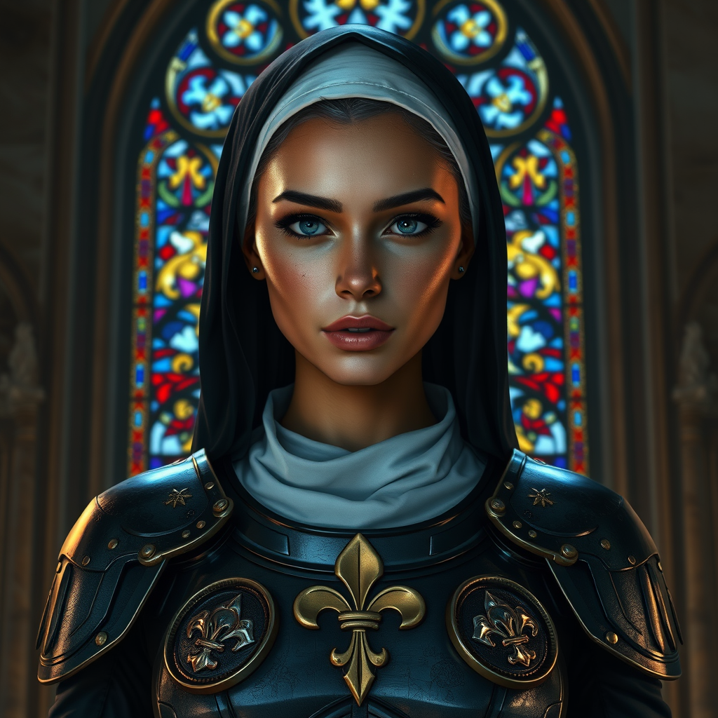 Beautiful woman of unparalleled grace and strength, reminiscent of a Sister of Battle, stands poised in front of a resplendent stained glass window. Her tanned skin glows with health, adorned with a delicate fleur de lys face tattoo. The armor she wears is a sci-fi nun's attire, adorned with wax seals that speak of her vows and battles. Her eyes, reflective and shadowed with dark eyebrows and mascara, hold a mysterious depth. Her face is detailed and symmetrical, emphasizing her striking features. The setting is grand, within marble-walled halls glistening with dust particles, where dramatic chiaroscuro lighting adds an air of intensity. This scene, inspired by Warhammer 40k style, evokes the works of renowned artists like Waterhouse, John Constable, and Jeremy Mann, capturing an impressionistic, majestic feeling. The atmosphere is enriched by intricate detail and emotive lighting, creating a moment that feels both historic and otherworldly, trending on ArtStation and CGSociety. This vision stands in high detail, devoid of distractions, embraced by a world of artful imagination.