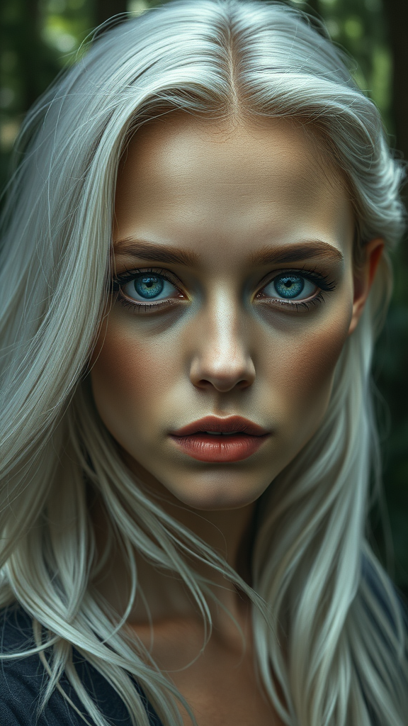 Beautiful woman with flowing white hair gazes at the camera with a melancholic expression, a single tear glistening on her cheek. The scene is painted in hyper-realistic style with exceptional detail and clarity, capturing every nuance of her perfect face. Her skin is richly textured, and her pupils are remarkably detailed, reflecting the lush forest backdrop. The composition has a cinematic quality, reminiscent of a candid studio shot with a cinematic camera. The artwork is distinguished by its high resolution and UHD quality, emphasizing the emotional depth and artistry without distractions from technical imperfections or irrelevant elements.