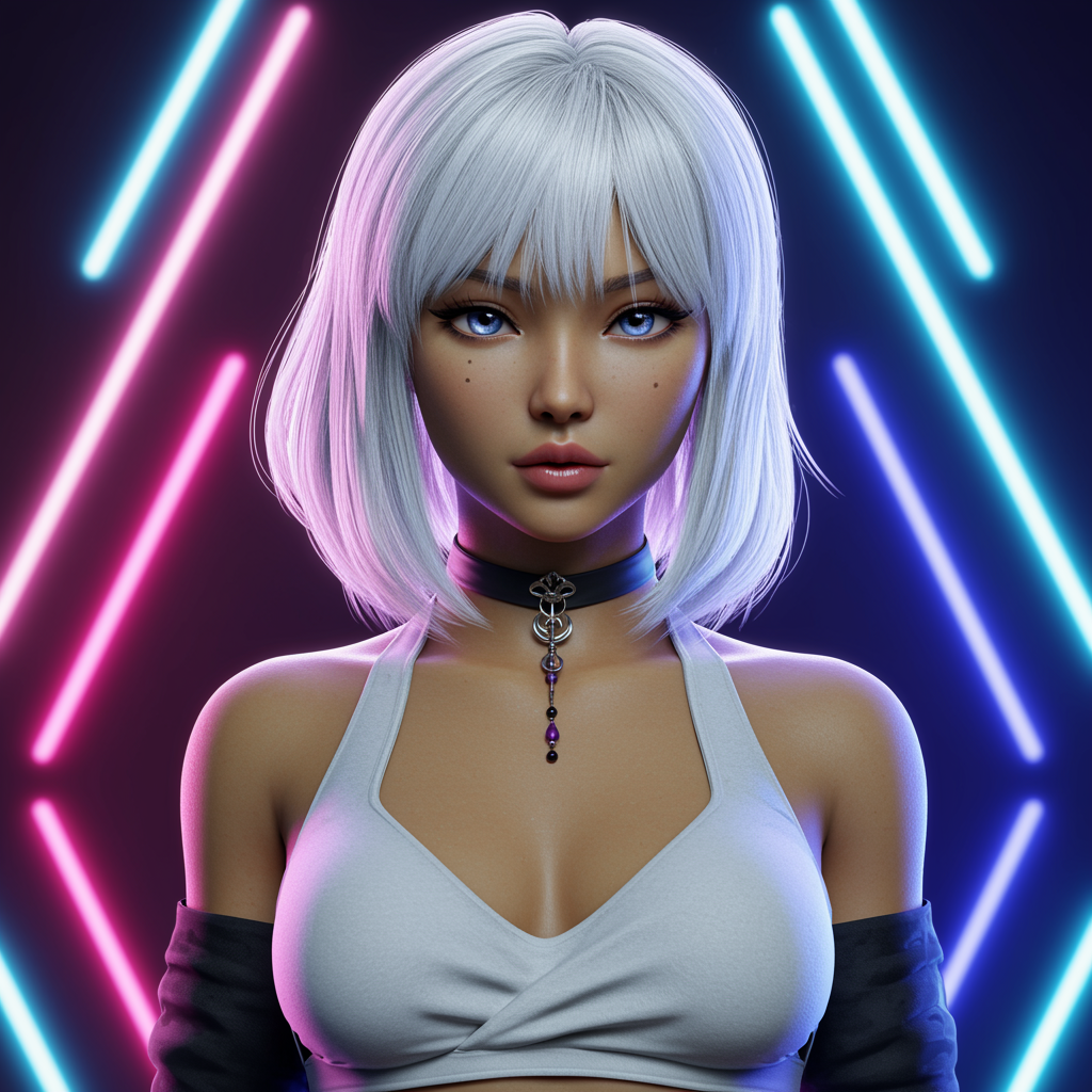 Beautiful young Asian woman with striking white hair and captivating eyes, her skin a glowing olive tone. She has medium-length white hair framing her perfect face. Her petite, toned body is highlighted by the midriff-baring attire. She stands against a neon-lit background, captured with cinematic lighting and breathtaking detail in 8k UHD resolution. Her symmetrical features and photorealistic appearance reflect hyperrealism in digital art. Adorned with elegant jewelry, she embodies a blend of CGI, 3D, doll-like charm, and anime influence. The digital illustration is executed flawlessly, avoiding common errors like jpeg artifacts, awkward proportions, and artistic mistakes to present a masterpiece of ultra-high resolution and detail.