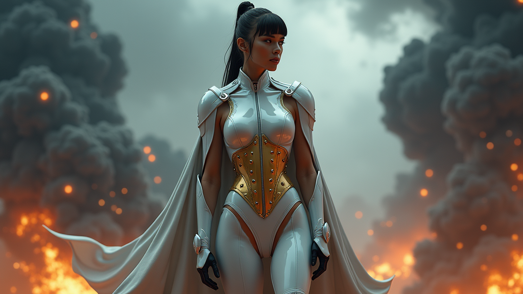 A stunningly beautiful young woman with a slender, athletic figure and an aristocratic face stands confidently. She wears glossy sci-fi battle armor reminiscent of Ghost In The Shell, featuring a tight white jumpsuit and armored leggings. A dense cloak billows behind her amidst a meteor shower, with black smoke and thunderclouds filling the dramatic, expressive background. Fires reflect off her armor, enhancing the gloomy, intense atmosphere. The scene is captured in hyper-realistic detail, with natural textures and cinematic lighting highlighting her bare arms, neck, and chest. The ensemble includes a gold corset adorned with rivets, while bright, almost blinding light enhances the symmetrical design. The environment evokes a sense of grandeur and impending chaos, devoid of any imperfection or distortion.