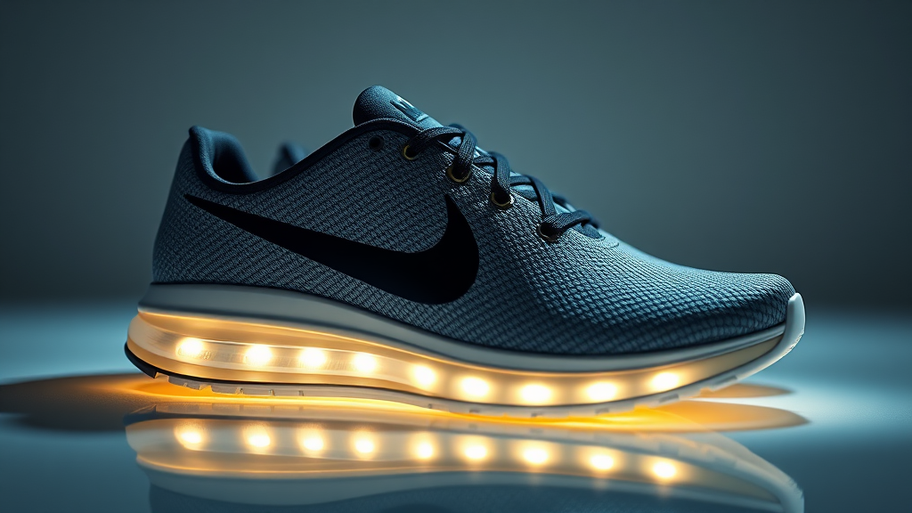 Beautifully illuminated Nike speed shoes crafted from rubber and composite fibers, featuring a sleek black Nike logo seamlessly integrated into the design, captured through the lens of Steven Meisel. The setting employs exquisite lighting with subtle indirect illumination, enhanced by the powerful capabilities of Unreal Engine and Octane Render for high-definition, ultra-realistic imagery, achieving an IQ of 180 --ar 2:3 --q 2.