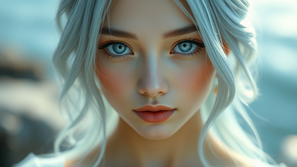 A masterpiece of breathtaking beauty, featuring Kamisato Ayaka with striking grey eyes and enchanting light blue hair, radiating elegance and grace in a serene setting.