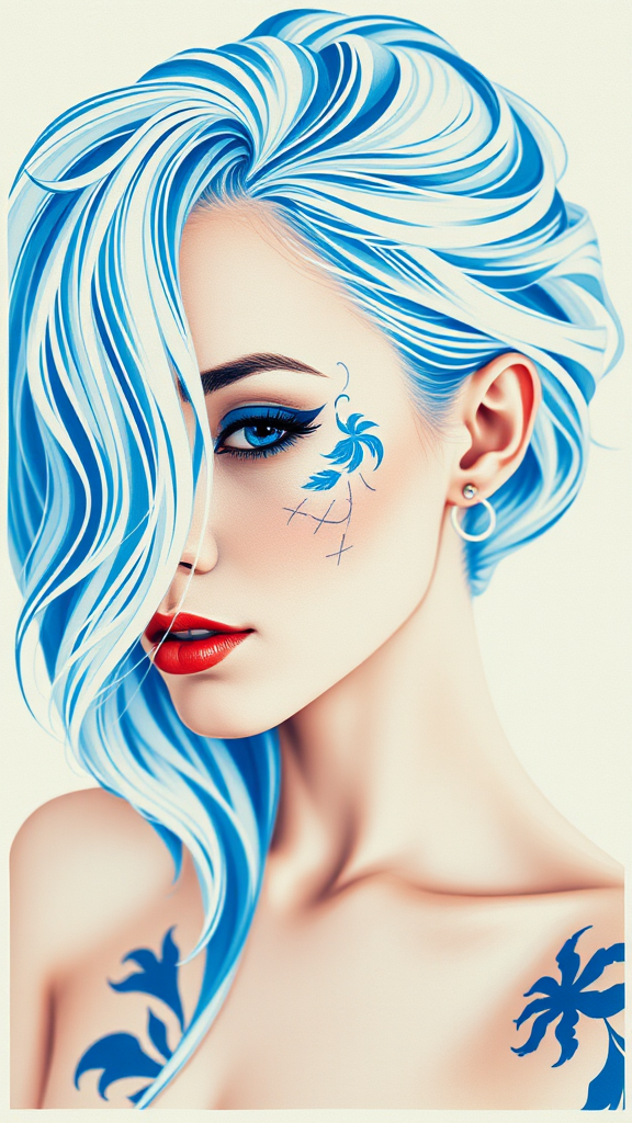 Beauty-inspired model tattoo designs by Karimah, featuring hair coloring for women, in a silkscreen style with dominant white and blue hues, incorporating rollerwave techniques and stenciled iconography reminiscent of Flickr aesthetics. The piece features smooth brushstrokes and a Provia effect, embracing a raw, unfiltered style with an aspect ratio of 9:16 and a touch of creative chaos.