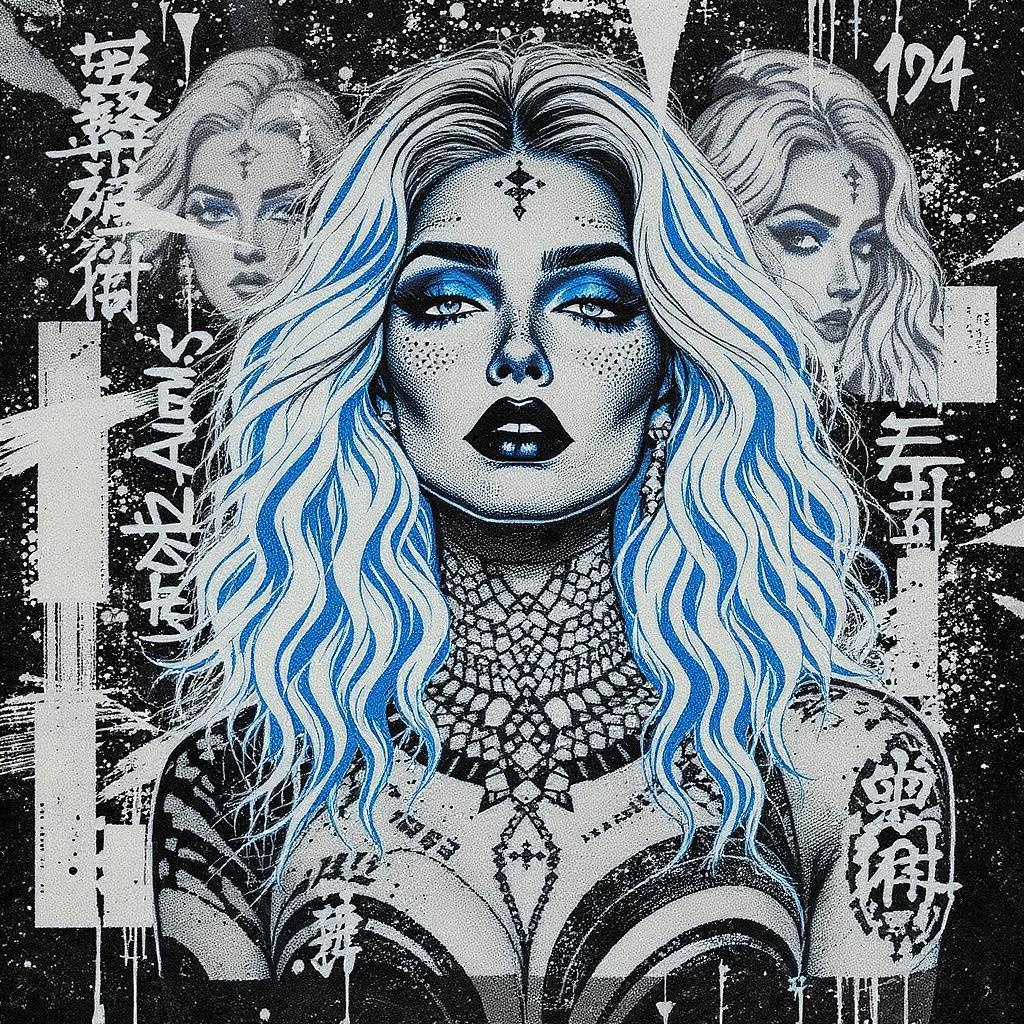 Beauty-inspired model tattoo designs by Karimah, featuring hair coloring for women in a silkscreen style, predominantly white and blue hues. A fusion of rollerwave and stenciled iconography, reminiscent of flickr aesthetics with smooth brushstrokes and a touch of provia. Capture it in a raw style with a 9:16 ratio and a hint of chaos.