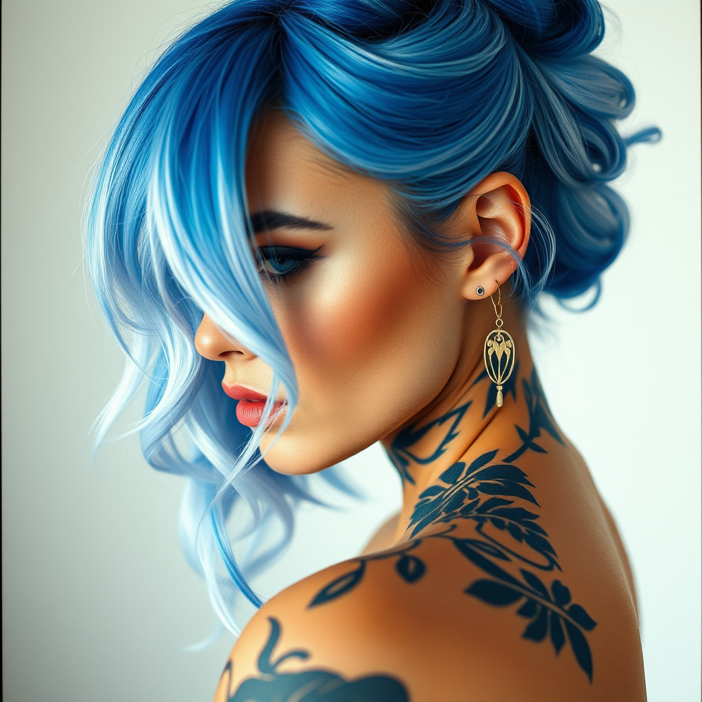 Beauty model tattoo designs by Karimah, featuring hair coloring for a woman, crafted in silkscreen style, with a palette of white and blue. Incorporating rollerwave elements and stenciled iconography, inspired by Flickr aesthetics with smooth brushstrokes. The visual texture mimics Provia film, maintaining a raw artistic style, framed in a portrait 9:16 aspect ratio with a touch of creative unpredictability.