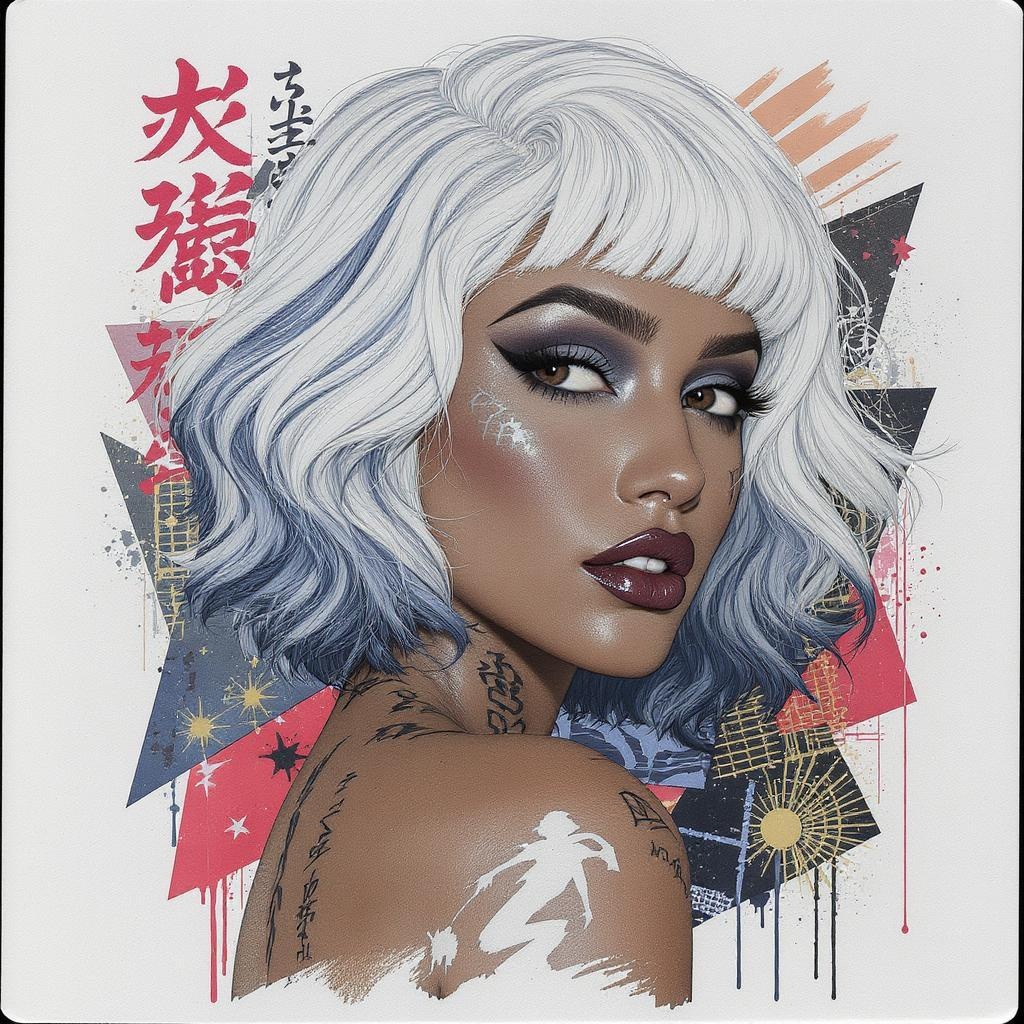 Beauty model tattoo designs by Karimah, featuring hair coloring for a woman, inspired by silkscreen art, incorporating white and blue hues, rollerwave style with stenciled iconography reminiscent of flickr aesthetics. Smooth brushstrokes in the spirit of provia, with a raw, natural style depicted in a 9:16 aspect ratio and a touch of playful chaos at a level of 15.