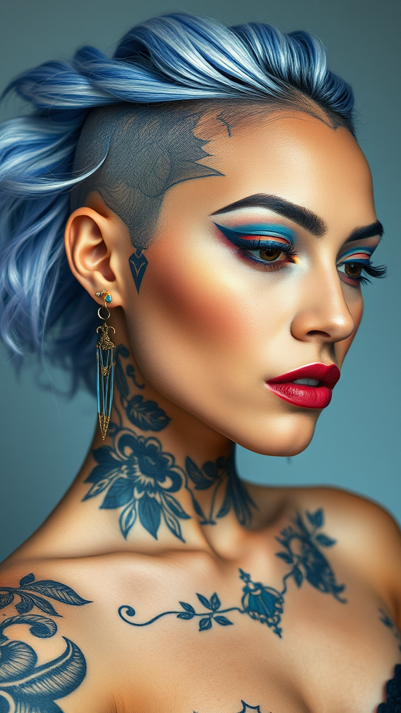 Beauty model tattoo designs by Karimah, featuring intricate hair coloring for a woman, styled in silkscreen with a color palette of white and blue, incorporating rollerwave patterns and stenciled iconography. Evoke the essence of a flickr aesthetic with smooth brushstrokes reminiscent of Provia film, capturing a raw and vibrant look. The composition should maintain a 9:16 aspect ratio with a touch of unpredictable flair.