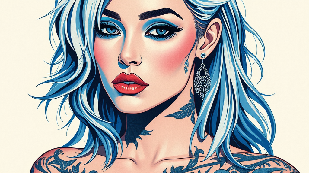 Beauty model tattoo designs inspired by Karimah, featuring innovative hair coloring for women, illustrated in a silkscreen style with a white and blue palette. Infused with rollerwave elements and stenciled iconography, capturing a Flickr aesthetic with smooth brushstrokes and Provia-like clarity. In a vertical 9:16 composition, maintain a raw style with a touch of creative unpredictability.