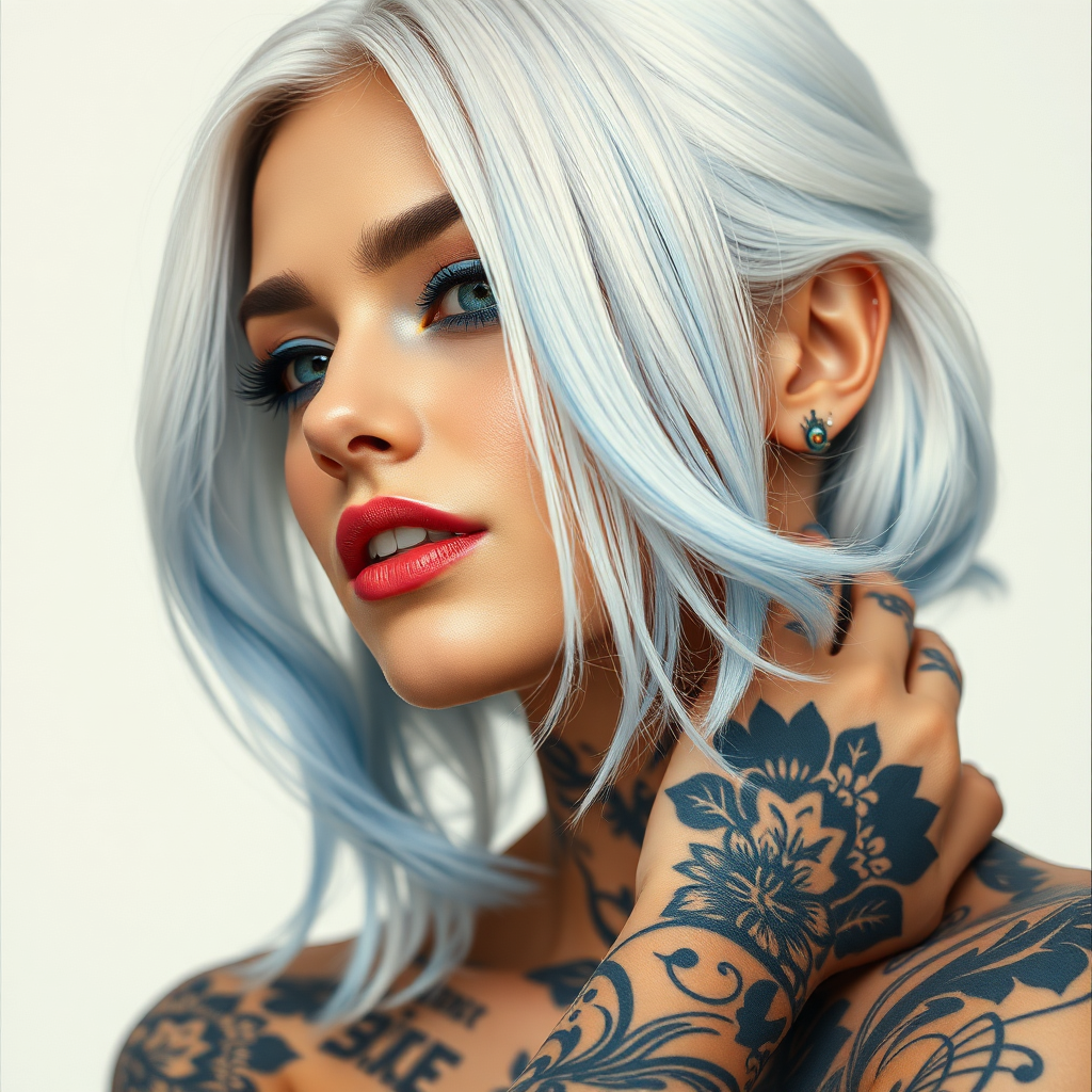 Beauty model with intricate tattoo designs by Karimah, featuring elegantly colored hair for a woman in silkscreen style, utilizing a white and blue palette. The design includes rollerwave patterns and stenciled iconography reminiscent of Flickr aesthetics, highlighted by smooth brushstrokes and a Provia film-like quality. Presented in style raw with an aspect ratio of 9:16, exuding a touch of chaos and creative flair.