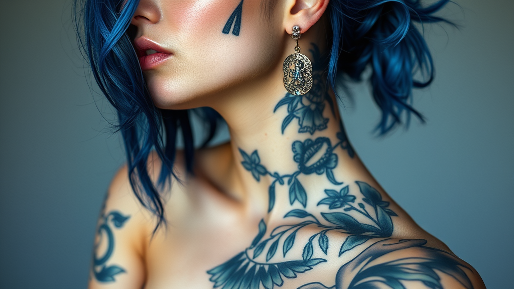 beauty model with intricate tattoo designs inspired by karimah, featuring unique hair coloring for women, in a silkscreen style, predominantly white and blue hues, embodying the rollerwave aesthetic, with stenciled iconography reminiscent of flickr, executed with smooth brushstrokes, provia influence, version 5.2, raw style, aspect ratio 9:16, with an element of controlled chaos 15