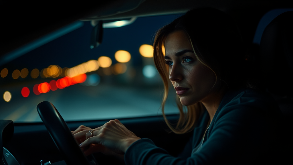 Becky gazes out from the driver's seat, her face illuminated by the glow of the dashboard, a mix of determination and vulnerability in her eyes. Her fingers tap nervously on the steering wheel, as the night unfolds beyond the windshield, a tapestry of shadows and fleeting lights reflecting her inner turmoil. Her thoughts race like the passing scenery, a silent storm of emotions hinted at by the subtle tension in her posture.