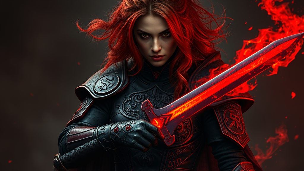 Before me stands a crimson-haired enchantress, her fierce locks and smoldering eyes cutting through the shadows. She is clad in foreboding black-red armor, intricately engraved with sinister red runes that pulse with the essence of blood magic. In her grip is a sword radiating a crimson mist, its glow surging up her arm like a river of life-force. Her gaze never wavers from mine, and I am enveloped by the palpable intensity of her dark power, as the air around us seethes with a mystical heat.
