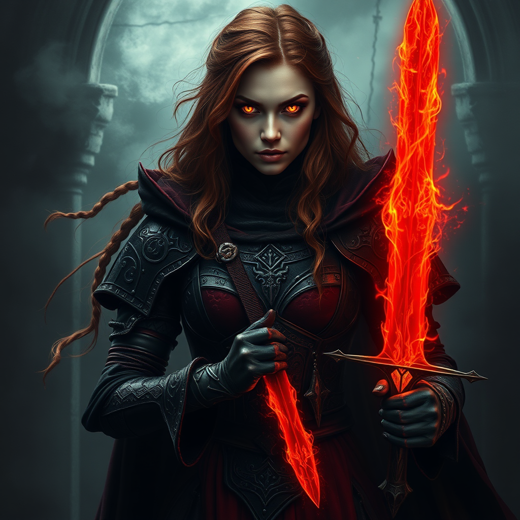 Before me stands a sorceress with hair the color of embers and eyes that blaze with an intense fire, slicing through the enveloping shadows. She is clad in menacing armor of deep black and red, inscribed with sinister runes that speak of dark magic. A sword enveloped in a crimson aura is gripped tightly in her hand, its pulsing energy creeping up her arm like a vital force. Her unwavering gaze locks onto mine, and I can feel the oppressive weight of her dark power as the air around us seems to shimmer with a supernatural heat.