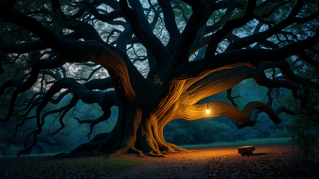 Beneath the ancient, gnarled oak tree, a secret world unveiled itself, where twilight's gentle glow revealed paths woven with silver threads and whispers of forgotten tales filled the air with magic.