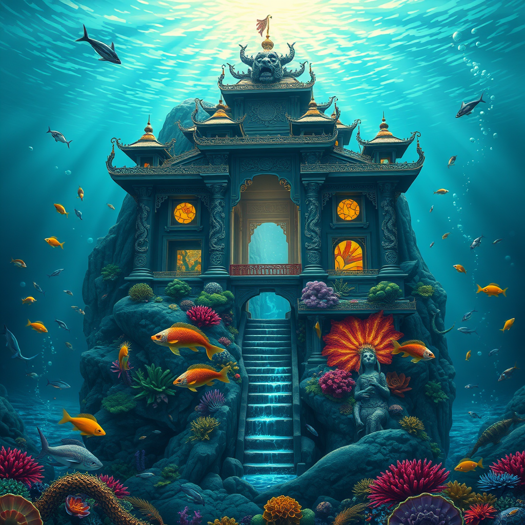 Beneath the ocean's depths lies a majestic palace perched atop an underwater mountain, where an imposing stone lion stands guard at the entrance, embodying the king's authority. Inside, the palace's intricate design features dragon pillars etched with vivid enigmatic creatures, as if they are quietly observing all that transpires within. Each corner emanates a unique aura, from a serene brook to a tranquil garden illuminated by radiant lights that resemble a starry night sky. A variety of fish glide gracefully through the water, while vibrant corals and shells, akin to exquisite art pieces, embellish the palace, creating a sense of having stepped into a mystical and enchanting realm. Surrounding this underwater kingdom are multitudes of fish, graceful sharks, leisurely turtles, and bubbles that rise gently to the surface.