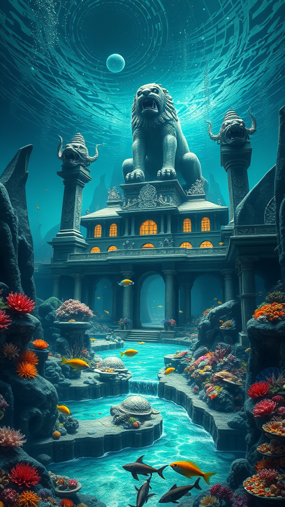 Beneath the ocean's surface lies a majestic underwater palace built atop a grand mountain, watched over by a colossal stone lion that commands the reverence of all who approach. Inside, the palace is an epitome of elegance, with intricate dragon pillars carved with mythical sea creatures that seem to listen and whisper the secrets of the deep. Each corner of this watery dwelling offers a unique ambiance; a serene stream flows through a tranquil garden, illuminated by radiant lights that twinkle like the cosmos. Schools of vibrant fish dance gracefully around, while a tapestry of colorful corals and shells adorns the palace like priceless art pieces. This realm feels like a journey into a mystical and enchanting kingdom, where diverse marine life including sharks, turtles, and playful bubbles drift through a dreamlike seascape.