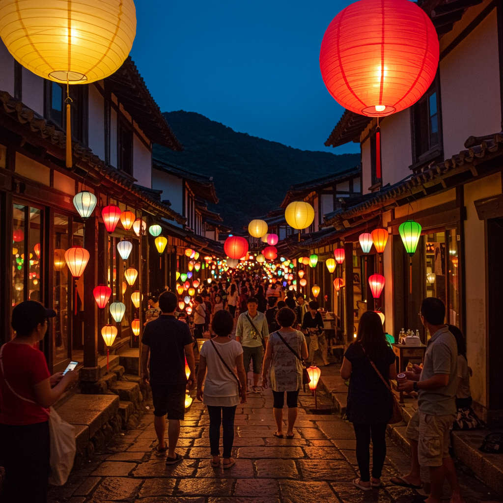 Beneath the shimmering glow of a thousand paper lanterns, the ancient village springs to life, its cobblestone streets echoing with the laughter and footsteps of travelers drawn in by the enchanting festival of lights.