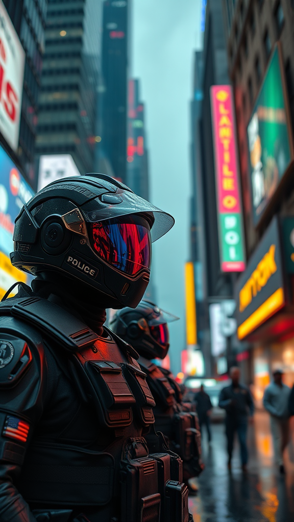 Beneath the towering skyscrapers of a cyberpunk city, police don lite-heavy riot gear adorned with advanced, intricately designed helmets. Neon lights from surrounding billboards and signage create captivating reflections across their armor, casting a kaleidoscope of colors in the rain-soaked streets. The scene is captured with dramatic cinematic lighting in an ultra-realistic, 8k resolution, showcasing a world both futuristic and gritty. The depth of field focuses on the officers in the foreground, while blurred cityscape elements hint at the bustling metropolis beyond. This intricate portrayal, akin to an unreal engine or octane render, evokes the tension and dynamism of this neon-laden, high-tech society – offering a vivid glimpse into a world where order meets chaos.