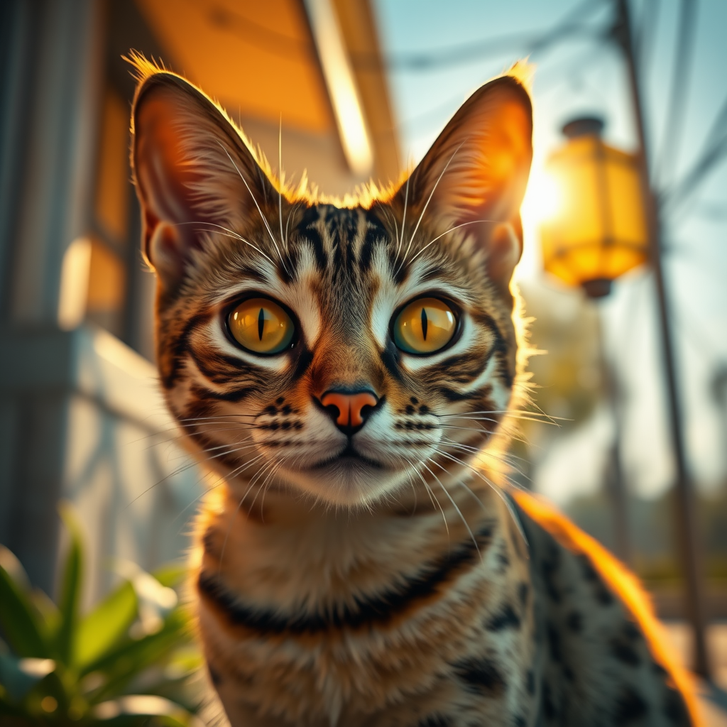 Bengal cat with captivating yellow eyes on a radiant, sunny day, showcasing realistic fur in photorealistic detail. The scene features hyper-detailed textures and ray traced lighting, with a cinematic feel enhanced by subtle neon light reflections and a warm lantern glow. Captured in third person view, the natural textures and lifelike fur are highlighted using natural light, emulating a Nikon D750, in stunning 8K HDR quality. The aspect ratio is a dramatic 9:16, inviting viewers into a world of vivid realism and immersive atmosphere.
