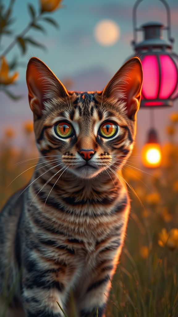 Bengal cat with striking amber eyes, set in a vibrant sunny landscape, showcasing intricate fur detail and hyper-realistic textures, captured with photorealism techniques. The scene is enhanced with subtle neon light accents and lantern illumination, viewed from a third-person perspective. Natural elements blend seamlessly with cinematic quality, employing advanced ray tracing for depth. Shot with the clarity of a Nikon D750 in 8K resolution, featuring HDR attributes to highlight every fine detail, maintaining a balance of natural light and color contrast for an immersive experience.