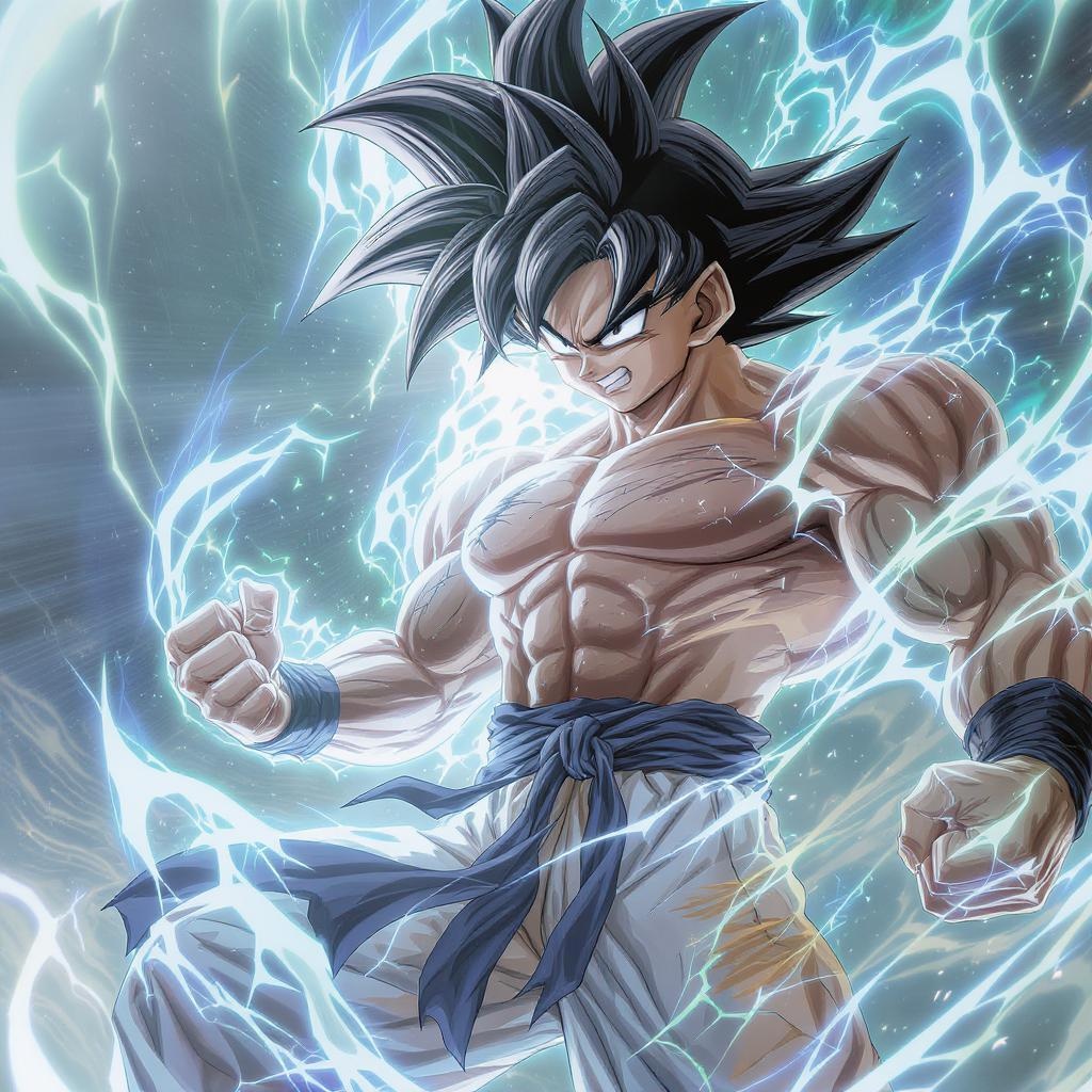 Best anime dragon ball fighter in the style of Thiago Valdi, with light black and silver accents, featuring a realistic depiction of light. The composition integrates light blue and silver tones, emanating a solarizing effect with a masterful touch. The fighter appears cut and ripped, exuding an energetic frenzy. The artwork captures the intensity and power of the character, set in a dynamic 9:16 aspect ratio, showcasing skillful artistry and vibrant energy within the scene.