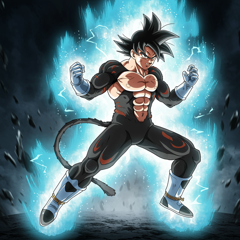 Best anime fighter inspired by Dragon Ball, in the style of Thiago Valdi, featuring light black and silver tones with a realistic depiction of light, light blue and silver accents, embodying a solarizing master with a cut/ripped physique and energetic frenzy, aspect ratio 9:16, emphasizing dynamic movement and intensity.