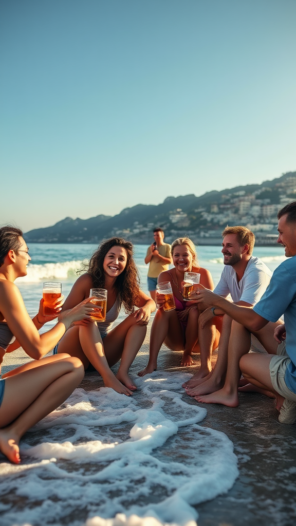 Best friends gathered on the sunlit shore of the French Riviera, a band playing lively tunes in the background, sipping on chilled beer as waves gently lap at their feet and laughter fills the salty air.