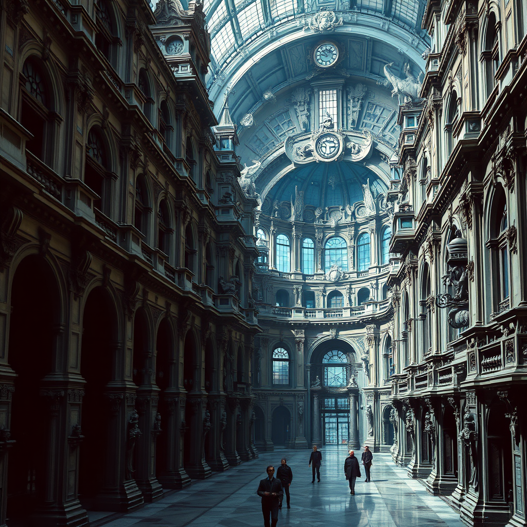 Best of the art gallery's, evoking the intricate styles of Oliver Wetter and Alberto Seveso, set in a cyberpunk dystopia. The palette features dark bronze and cyan, blending into the elaborate architectural forms inspired by Artemisia Gentileschi. Shaded with dark gray and light aquamarine, the scene captures a fusion of the classical and futuristic, creating an atmosphere that is both complex and captivating.