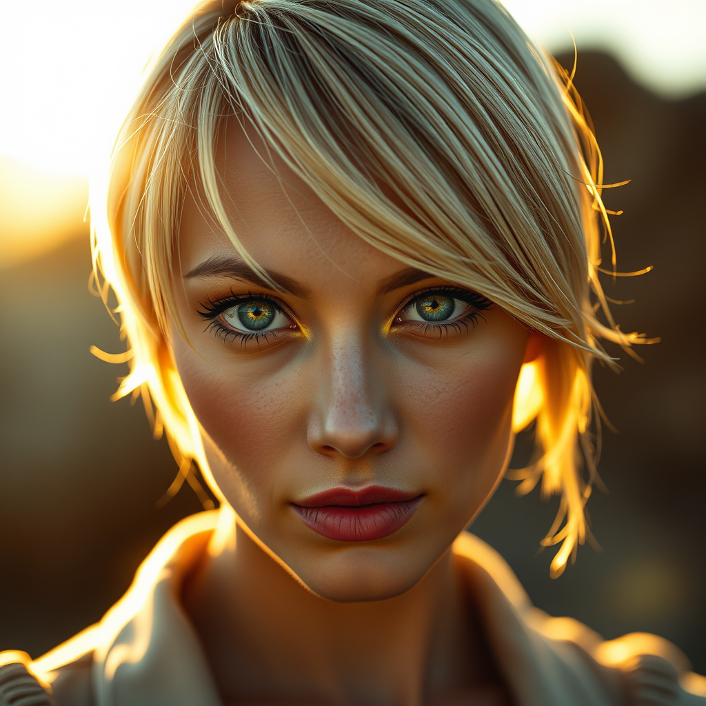 Best quality, 4k, highres, masterpiece, ultra-detailed, realistic, portrait of a short-haired blonde woman bathed in golden light, with striking green eyes, sharp focus, complex and highly detailed visual, cinematic, candid scene capturing true-to-life colors, imaginative and pure, flawlessly beautiful, graceful, elaborately composed, self-assured, dynamic presence, rich volumetric lighting, cinematic perspective, with a vibrant and glamorous aura.