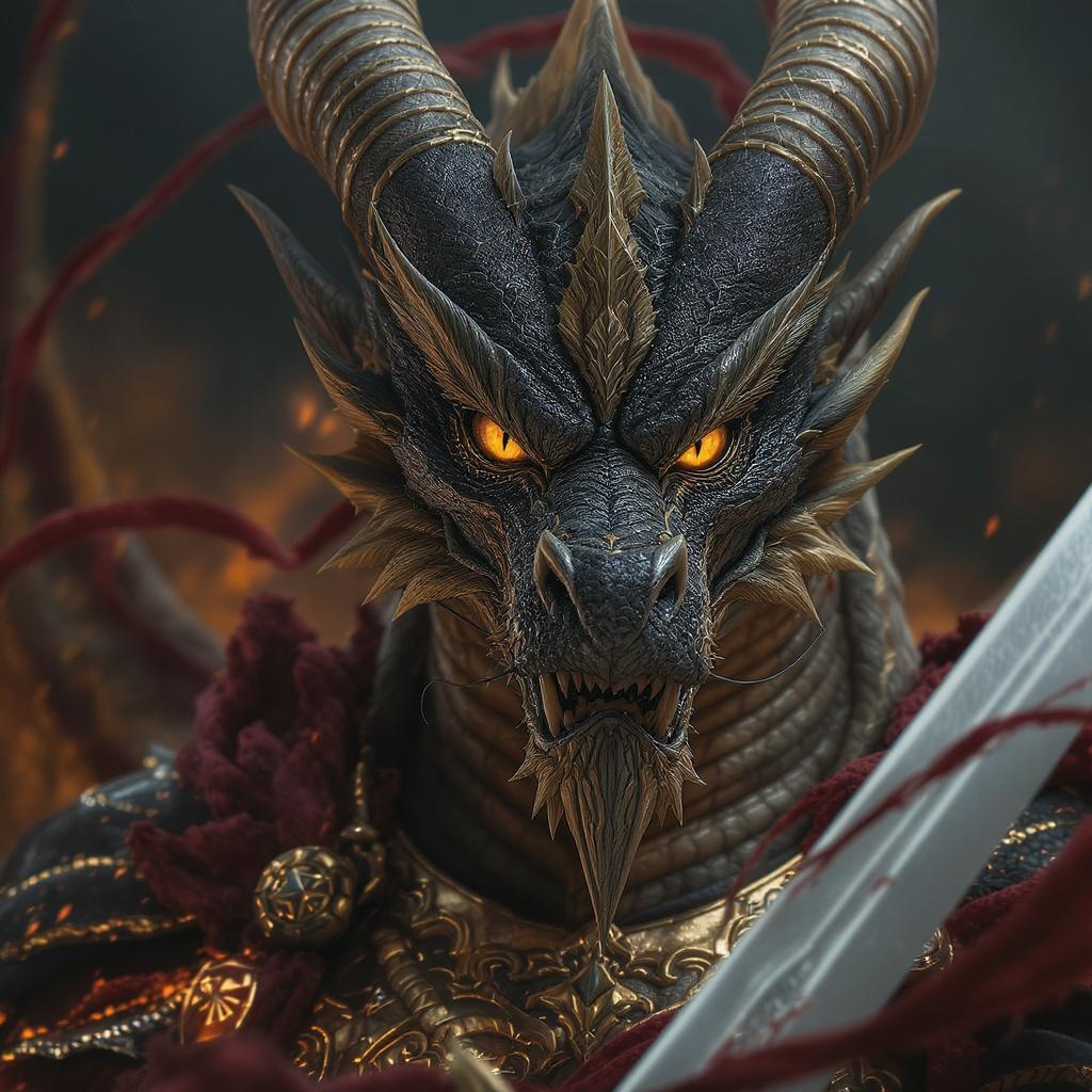 "best quality, captivating eyes, flawless face, dragon warrior, wielding a sharp sword, ultra-high definition clarity, impeccable symmetry, absolute perfection, 8k detail, exclude negative traits like poor quality, text elements, watermarks, distortions, peculiar anatomy, excessive limbs or digits, realism inconsistencies, disjointed body parts, mismatched or unfocused eyes, asymmetry, lack of clarity, mutations, deformities, composition issues, duplications"