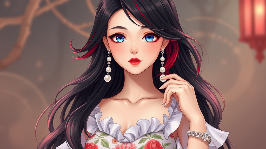 Best quality, Detailed, Beautiful, Pretty, Alluring kawaii woman, seductive, attractive, 32 years old, Deep graphite black hair with fiery flame-red tips, Elegant long floral dress with graceful ruffles, exquisite pearl drop earrings, a delicate charm bracelet, paired with sparkling sequined sandals, captivating pearl violet eyes, breathtakingly charming with vibrant red lips, Ultra high-definition, HDR10, 16K resolution, maintaining essence and elegance. ReV Animated v1.21 ensures seamless features and immaculate details without duplication or distortion, preserving the beauty without any anomalies or visual distractions.