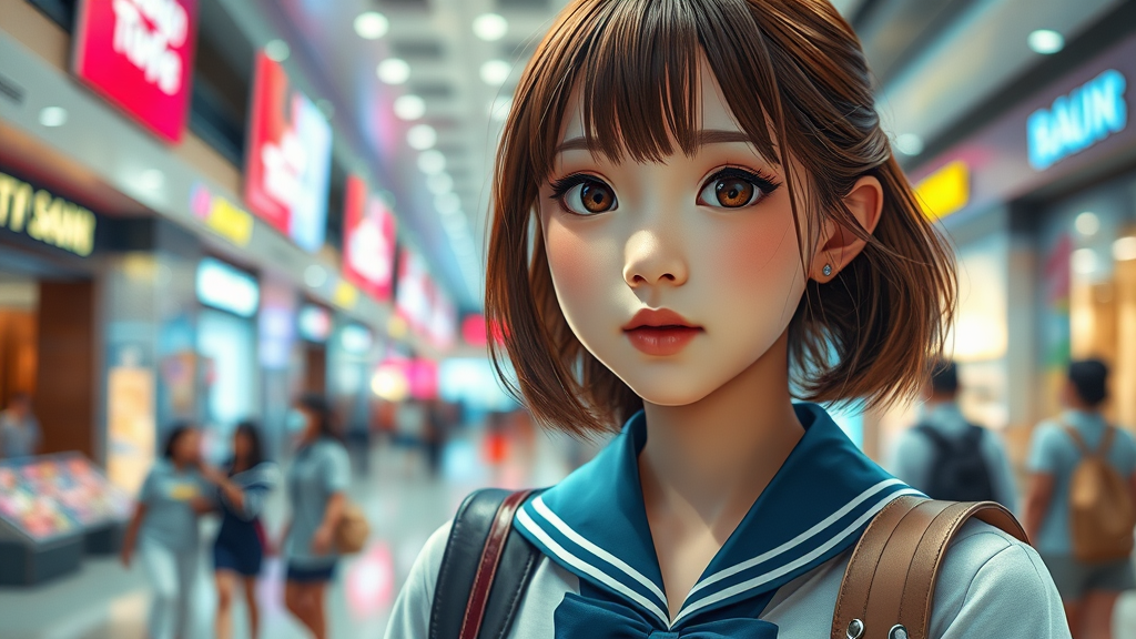 Best quality, high detail, sharp focus, highly detailed face and bright eyes, high school girl with medium brown hair, intricately designed high school uniform, enjoying shopping in a bustling mall interior, enhanced with volumetric lighting and global illumination. The scene is rich with vivid color, reflections on polished surfaces, soft shadows adding depth, and a dynamic depth of field effect, capturing the vibrant energy of the environment with a professional touch.