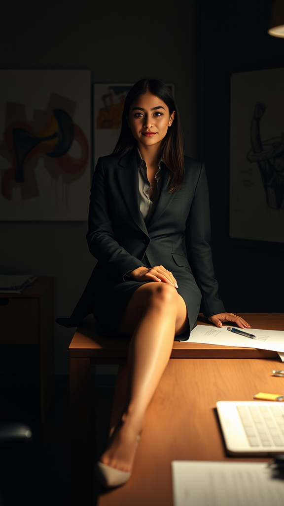 Best quality, hyper detail, finely detailed, colorful, delicate, 8k uhd, film grain, ultra high res, best quality photo, 4k, in the dark, deep shadow, low key. Gini, a young woman, sitting confidently on a desk in an office environment. She is wearing a career suit paired with a sleek skinny pencil skirt. The scene is subtly illuminated, emphasizing the rich textures and colors in contrast to the shadowy surroundings, creating an artistic, almost cinematic effect. The background is adorned with abstract paintings and sketches, enhancing the creative atmosphere. The image captures both professionalism and creativity, with nuanced lighting and exquisite detail in every element.