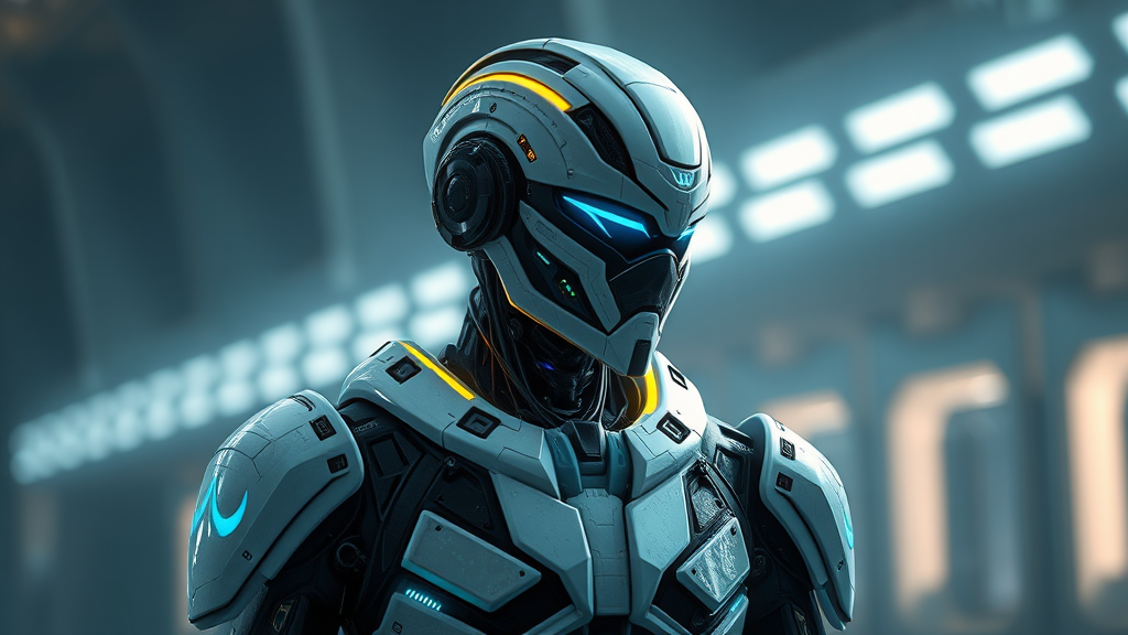 best quality masterpiece cg wallpaper hdr high-definition ultra-detailed photorealistic futuristic military cyborg cyberpunk warframe stealth armor neon accents camouflage in white black and blue epic character design hard surface smooth intricate facial features detailed symmetry volumetric and ambient lighting real-time vfx side profile unique asymmetrical elements realistic portrayal ambient shadows and highlights