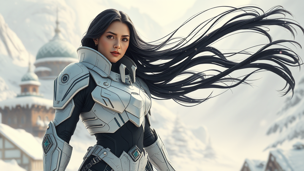 best quality, masterpiece, highly detailed, ultra-detailed, a stunning woman, advanced futuristic armor, snow-covered structures nearby, inspired by greg rutkowski and thomas kinkade, trending on artstation and deviantart, octane render, unreal engine, 4k hd wallpaper, digital painting concept with volumetric lighting, pixar-like style, 3 point perspective, 20 mm lens, photorealistic shadows and highlights, sharp focus, nvinkpunk, kuvshinov, dreamlikeart, samdoesart, modelshoot style, flowing long black hair, dynamic hair motion, standing tall, full body shot.