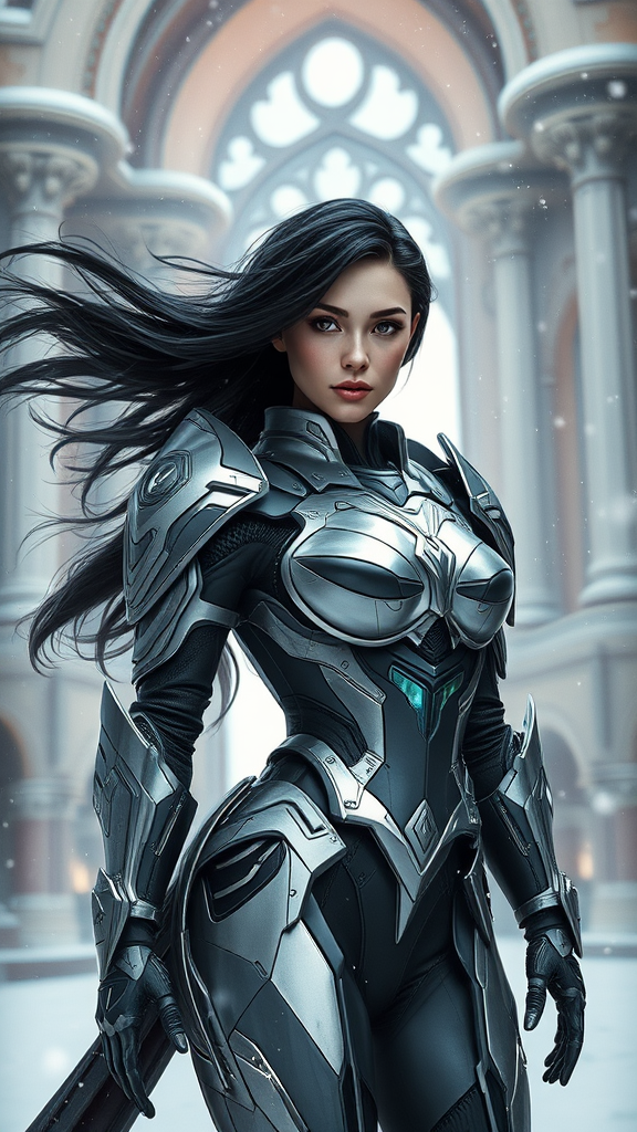 best quality, masterpiece, highly detailed, ultra-detailed, stunning woman in futuristic armor, surrounded by snowy architecture, inspired by greg rutkowski and thomas kinkade, trending on artstation and deviantart, rendered with octane and unreal engine, 4k hd wallpaper, digital painting concept with volumetric lighting, pixar style using 3 point perspective and 20 mm lens, photo realistic shadows and highlights, sharp focus, nvinkpunk, kuvshinov, dreamlikeart, samdoesart, styled like a model shoot, long flowing black hair, in motion, standing tall in a full body shot, flawless depiction, captivating and elegant composition.