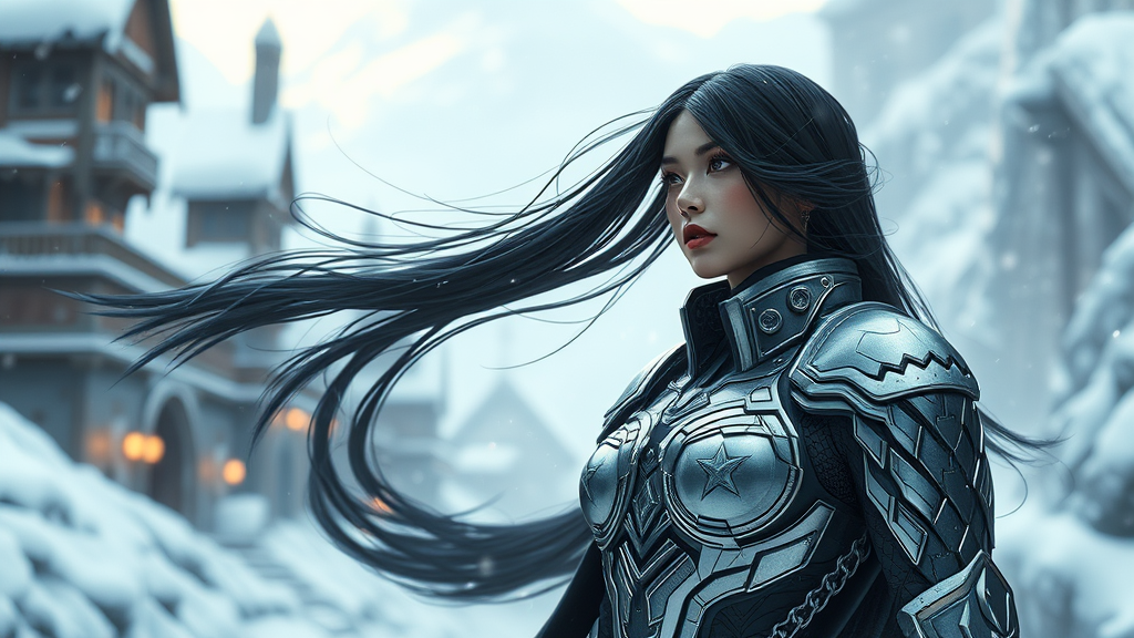 Best quality masterpiece highly detailed ultra-detailed beautiful woman futuristic armor snowy buildings nearby by Greg Rutkowski and Thomas Kinkade trending on ArtStation DeviantArt octane render unreal engine 4K HD wallpaper digital painting concept volumetric lighting Pixar 3 point perspective 20mm photo realistic shadows highlights sharp focus nvinkpunk Kuvshinov dreamlikeart SamDoesArt modelshoot style long flowing black hair hair movement standing tall full body shot majestic serene captivating environment realistic scene ethereal grace blending fantasy and reality innovative lighting techniques dynamic composition harmonious balance breathtaking visuals expressive features human form sculpted with precision intricate textures compelling narrative within the artwork.