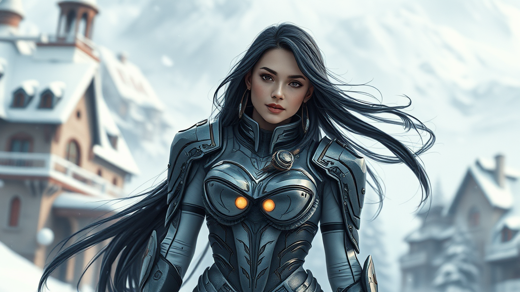 Best quality, masterpiece, highly detailed, ultra-detailed image of a beautiful woman in futuristic armor, with snowy buildings nearby, inspired by the styles of Greg Rutkowski and Thomas Kinkade, trending on ArtStation and DeviantArt. Rendered using Octane Render and Unreal Engine, this 4K HD wallpaper captures the essence of digital painting concept art, with volumetric lighting and a Pixar-esque 3-point perspective. Shot from a 20mm lens for a photo-realistic effect, the scene features realistic shadows and highlights with sharp focus. The aesthetic combines elements from Nvinkpunk, Kuvshinov, Dreamlikeart, and Samdoesart, evoking a model shoot style. The woman stands tall with long black hair flowing dynamically, capturing a full body shot that exudes elegance and strength, ensuring top-notch quality and anatomical accuracy.