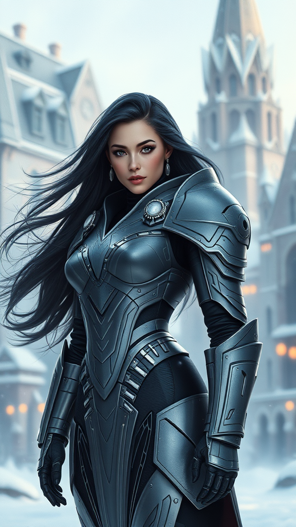Best quality masterpiece, highly detailed, ultra-detailed, a stunning woman in futuristic armor, with snowy buildings in the background, reminiscent of the works of Greg Rutkowski and Thomas Kinkade trending on ArtStation and DeviantArt, octane render, Unreal Engine, 4k HD wallpaper digital painting concept with volumetric lighting, Pixar-like charm, 3-point perspective, 20 mm photo-realistic touch with sharp focus. Imagine Nvinkpunk, Kuvshinov, dreamlikeart, and Samdoesart styles blending together. The woman features long, flowing black hair capturing motion, standing tall in a full-body shot with impeccable anatomy and elegant posture. The scene captures the essence of a winter landscape while highlighting the intricate details of her armor, creating a visionary representation suited for artistic platforms without errors or visual imperfections.