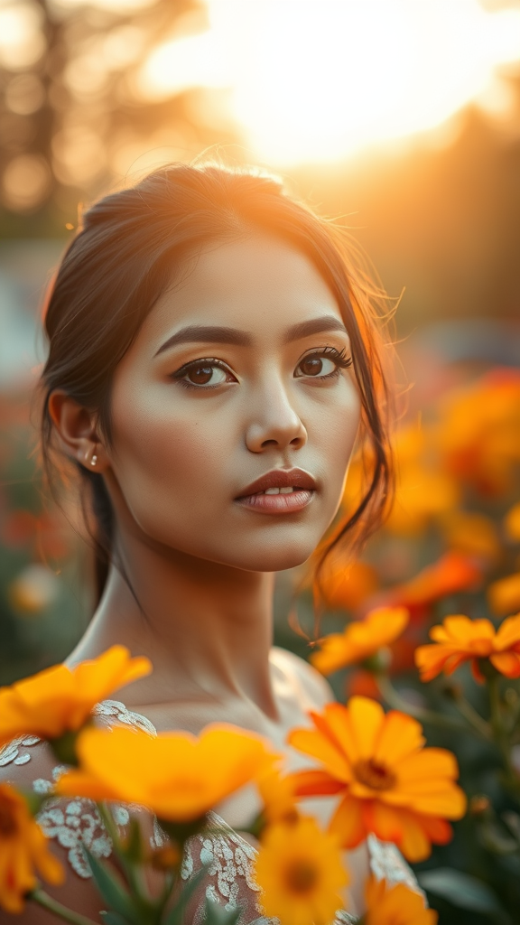 Best quality photography, 8K resolution, HDR, high-resolution with a soft, blurry background enhanced by bokeh effect:1.3, reflecting professional photography standards. The scene captures a person with sharp focus:1.4 beneath a morning sky, gracefully posing in a vibrant flower garden, outdoors, set for a photoshoot. The subject features highly detailed skin with a radiant complexion, a strikingly beautiful face, and captivating, clear eyes with detailed pupils. Their look is accentuated by glossy lips and a subtle blush on the cheeks, complemented by small, elegant earrings. Emphasizing natural beauty, the atmosphere avoids associations with paintings or sketches, ensuring high quality with sharp details and perfect clarity, vividly capturing an essence that is both genuine and artistically refined.