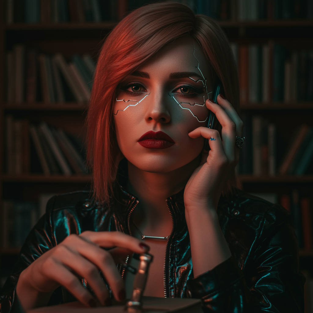 Big close-up portrait of a female cyberpunk in a library, featuring deep red lipstick. It's evening, and the scene is captured in hyper-realistic fashion photography at 4k resolution. The composition is intimate, with moody rim lighting and ultra-detailed features. Ray-traced reflections add depth, resembling a Cinestill 800T film look. The aspect ratio is 9:16, with a focus on vibrant and detailed facial features, avoiding errors like cropping, poor quality or distortions. The portrayal maintains a realistic anatomy, with a natural face and hands. No extra limbs or unusual proportions present. The overall atmosphere is sleek and polished, free from watermarks or signatures.