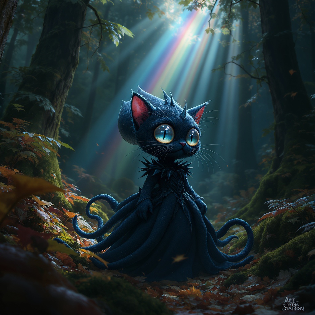 View this AI-generated image featuring a bizarre but adorable big eyed space squid kitten clad in a shadowy spiked gown gracefully explores a vibrant and dense forest under ethereal beams of rainbow colored light the scene reminiscent of trending artstation matte paintings blends animation style lig