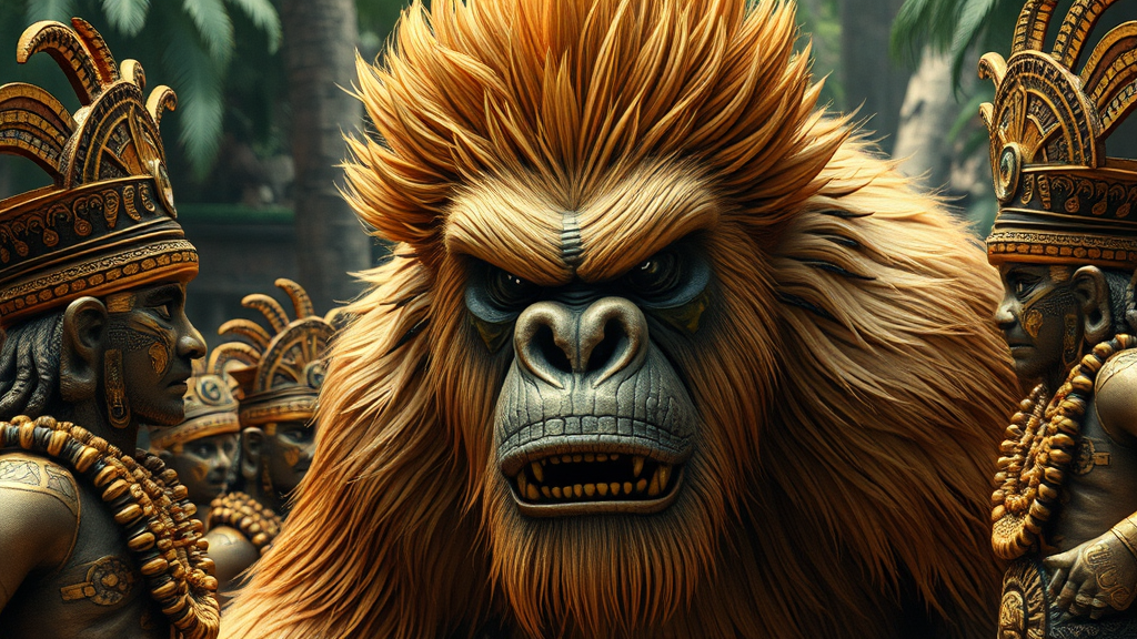 Bigfoot, a mysterious creature with a deep growl, stands amidst the ancient Mayan tribes. Its eyes are a mesmerizing silver, contrasting with its shimmering golden hair. The scene is captured in full detail, showcasing exquisite decorations with a rich and elaborate style. The realistic 3D micro details bring this mythical being to life with an awe-inspiring presence.