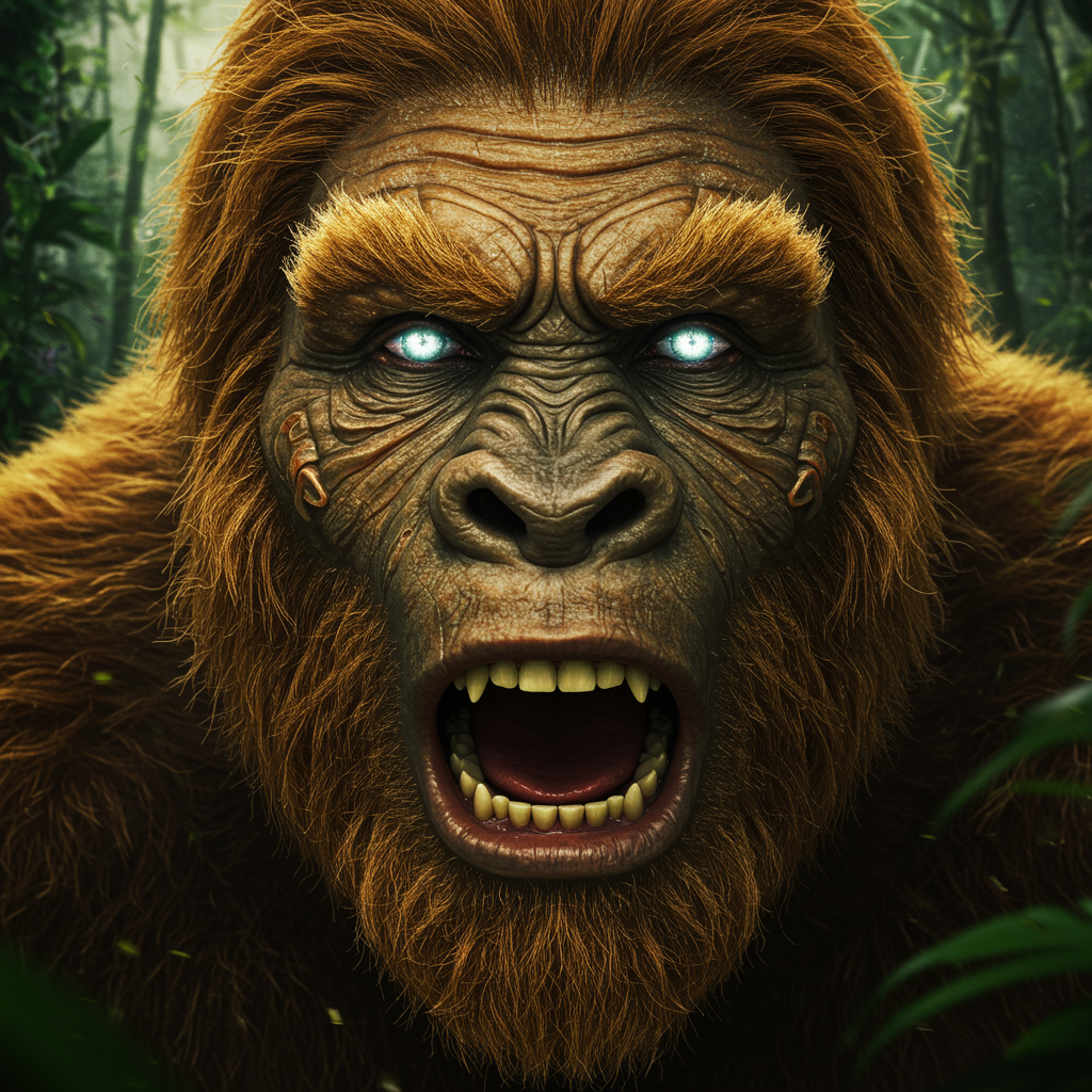 Bigfoot, deep roar, Mayan civilizations, intense close-up, shimmering silver eyes, lustrous golden fur, intricate detail, lavish embellishments, opulent style, lifelike 3D micro details, ethereal glow, mythical allure.