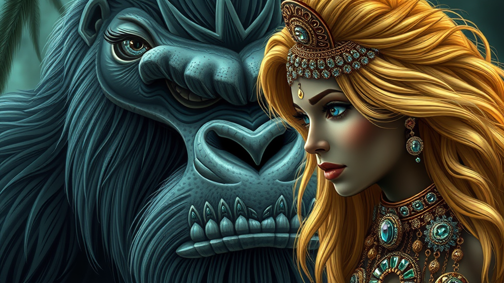 Bigfoot, resonant growls, ancient Mayan tribes, intense focus, luminous silver eyes, lustrous golden hair, intricate detailing, exquisite jewelry, opulent style, --ar 4:5.