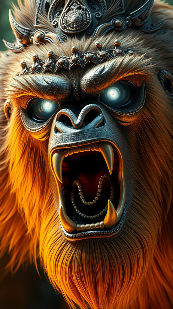 Bigfoot, roar, ancient Mayan connections, intense close-up, luminous silver eyes, radiant golden fur, intricate details, luxurious embellishments, opulent style, hyper-realistic 3D textures, --ar 4.