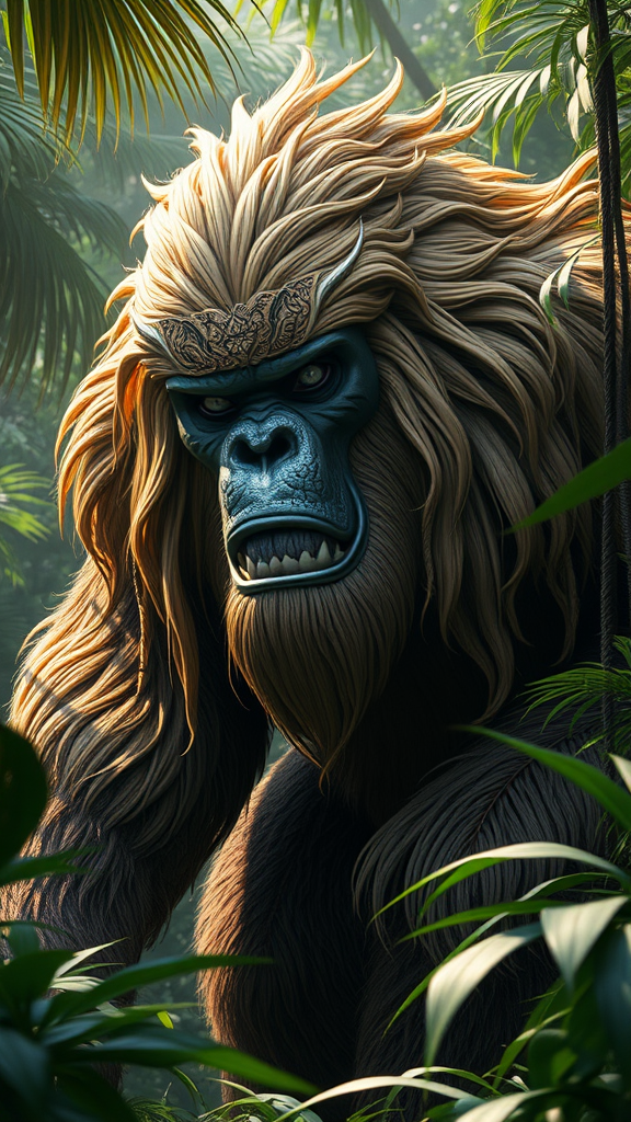 Bigfoot, with a deep growl, emerges from the lush jungles once inhabited by ancient Mayan tribes; his silver eyes and flowing golden hair capture the light. His appearance is a marvel of full detail, adorned with exquisite decorations inspired by rich Mayan artistry. His presence feels both realistic and otherworldly, with 3D micro details highlighting the intricate patterns of his majestic fur and the subtle interplay of light and shadow across his imposing form.