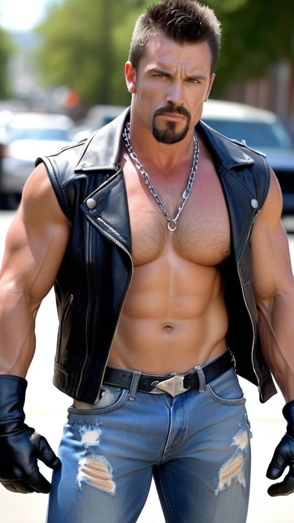 Biker/motorcycle guy, street justice, motorcycles, testosterone. Caucasian male, short dark brown hair, royal blue bandana tied around forehead. Sky-blue eyes, soul-patch and short trimmed goatee on face, strong jaw and brow, chisleled chin. Hypermasculine, handsome, rugged, brawny broad chest, sinewy and muscular, rugged male,big muscles, bodybuilder. Hirsute hairy chest, arms, legs {{{hairy chest, hairy body}}} Shirtless, sweaty body. Silver chain around neck. Black leather biker boots, black leather biker gloves, ripped/torn jeans. full body pose, shirtless , arms up bicep flexing, dark ample hair in armpits. {{{MASTERPIECE}}}