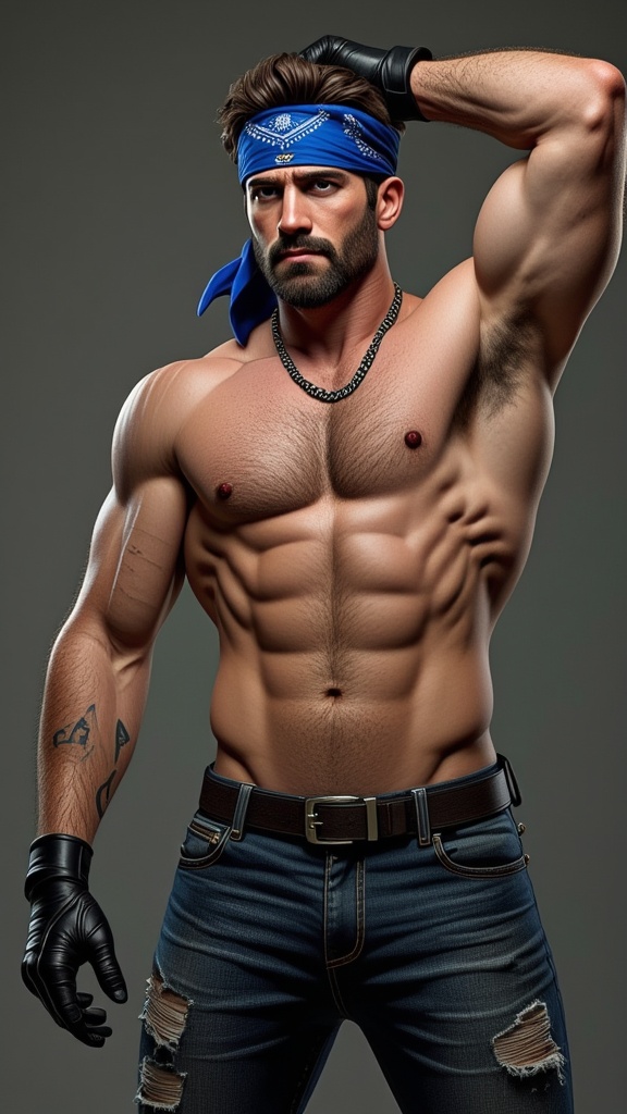 Biker/motorcycle guy, street justice, motorcycles, testosterone. Caucasian male, short dark brown hair, royal blue bandana tied around forehead. Sky-blue eyes, soul-patch and short trimmed goatee on face, strong jaw and brow, chisleled chin. Hypermasculine, handsome, rugged, brawny broad chest, sinewy and muscular, rugged male,big muscles, bodybuilder. Hirsute hairy chest, arms, legs {{{hairy chest, hairy body}}} Shirtless, sweaty body. Silver chain around neck. Black leather biker boots, black leather biker gloves, ripped/torn jeans. full body pose, shirtless , arms up bicep flexing, dark ample hair in armpits. {{{MASTERPIECE}}}