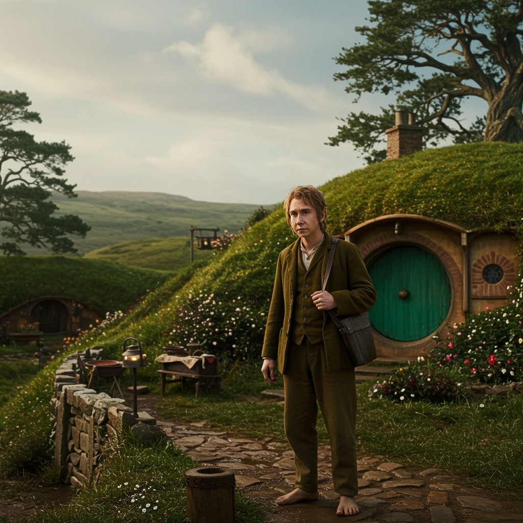 Bilbo :: Hobbiton, Middle-earth saga, epic panoramic view, hyper-realistic, cinematic lighting, captured with Hasselblad, ISO 64, 8K resolution, in the style of Norman Rockwell, photo by Annie Leibovitz, vibrant color palette, clear focus, --ar 16:9 --q 3 --v 4 --s 800